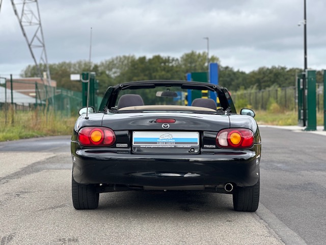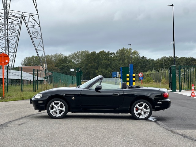 Deze tijdloos uitgevoerde MX-5 verkeert in een goede, verzorgde en eerlijke conditie. Het ‘Brilliant Black’-lakwerk glanst mooi en heeft de tand des tijds goed doorstaan. Rondom zijn er natuurlijk wel kleine gebruikssporen te vinden aangaande de leeftijd. De vinyl softtop verkeert in goede conditie met op 1 plek een kleine beschadiging die in het verleden reeds gerepareerd is. Verder staat de wagen ook nog steeds op zijn originele 15 inch lichtmetalen velgen in goede toestand.